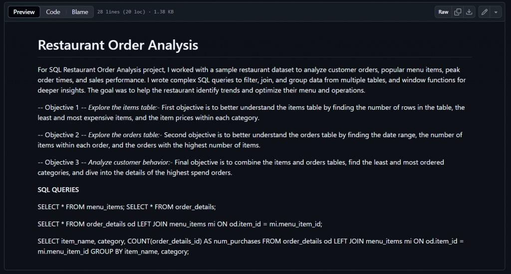Analyzed customer orders, identified popular menu items, evaluated peak order times, and assessed overall sales performance. The goal was to use SQL to uncover patterns and trends that can guide restaurant management decisions.
