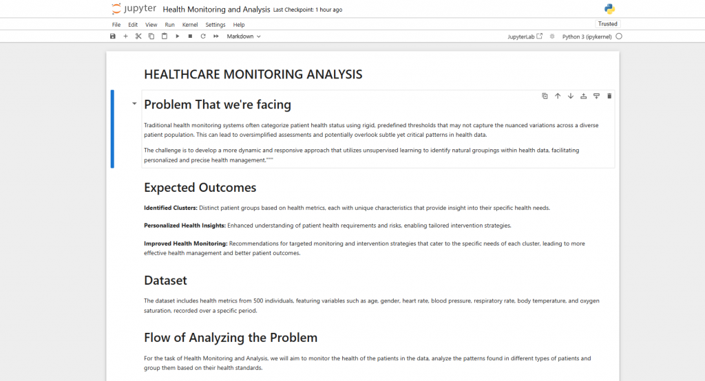 Traditional health monitoring systems often categorize patient health status using rigid, predefined thresholds that may not capture nuanced variations across a diverse patient population. The challenge is to develop a dynamic and responsive approach using unsupervised learning to identify natural groupings in health data, enabling personalized and precise health management.